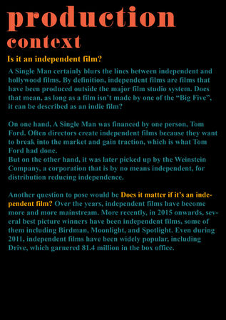 My first attempt at a trailer was not very successful. Although it was attempting to illustrate the plot of the film, including Julianne Moore in my trailer posed the possibility of the audience being confused. Therefore, I eliminated that possibility by removing her from the trailers. I also changed a few things up in order to fit the conventions of a trailer better, such as the ratings in the beginning of the video and adding more text. Additionally, I added dialogue as the first trailer felt a bit dry, and wouldn’t be able to hook the audience. The text that appeared was also catered towards the audience, instead of featuring Volpi Cup for Best Actor for Colin Firth, I chose the Queer Lion Award from the Venice International Film Festival, which is awarded to the “Best Movie with LGBT Themes & Queer Culture”. I also decided to add “A Film By Tom Ford” rather than including a quote from a critical review like the original trailer. This was because I believe that many of my audience would be able to recognise his name and be familiar with his work and it could act as star appeal.